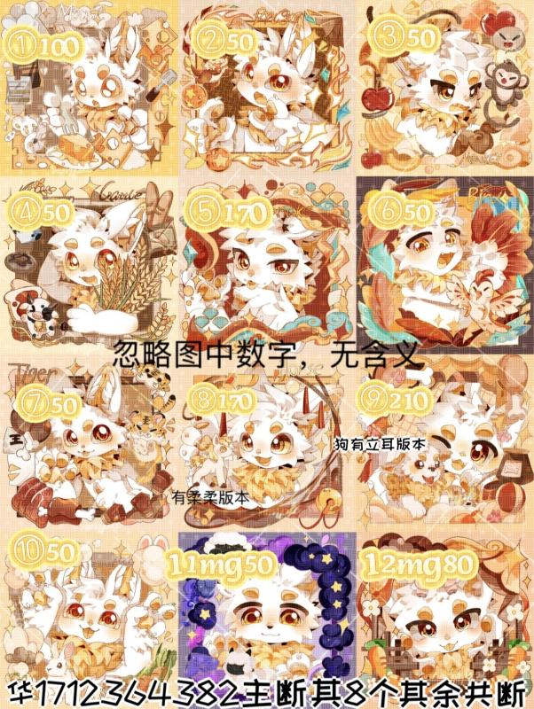 9.9r一面,全套有六面。买三面以上赠送特典。全部打包仅需49块9,一共70只兽。这一页有16~17个配件,常用均有底色阴影。每一支均可单拆不限制自印,可以随意发物料。但禁止投ai